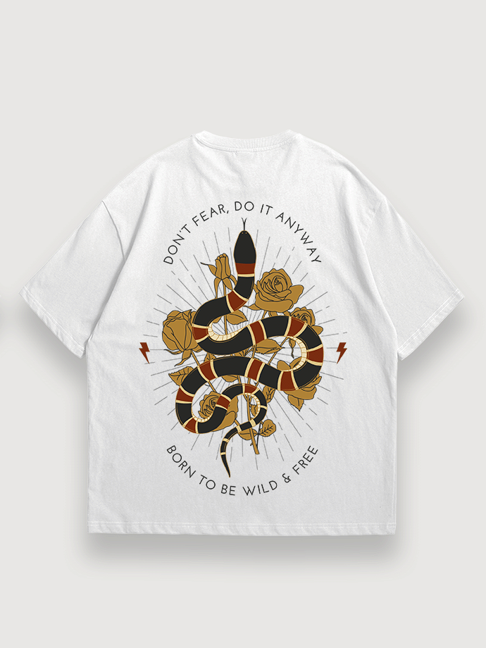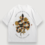 Embrace your wild side with the “Rebel’s Creed” tee. This design features a powerful, tattoo-inspired illustration of a serpent and roses, symbolizing the union of beauty and danger. Encircled by the mottos ‘Don’t Fear, Do It Anyway’ and ‘Born to Be Wild & Free,’ it’s a bold declaration of courage and untamed spirit. This isn’t just a design; it’s a philosophy. Wear your conviction.