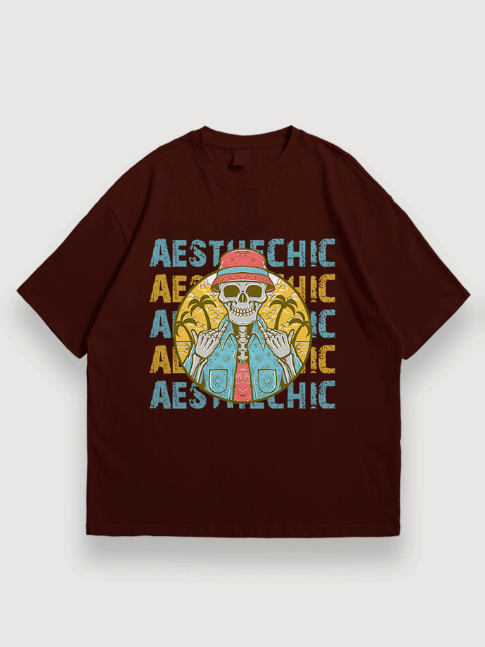 Chill vibes that last an eternity. This design proves that true style never dies, featuring a laid-back skeleton on a permanent tropical holiday. The vibrant, retro-distressed graphic combines sunny palm trees with a cool ‘AESTHECHIC’ backdrop, creating a perfect blend of dark humor and vacation-mode energy. For those who live life to the fullest and look good doing it, forever.
