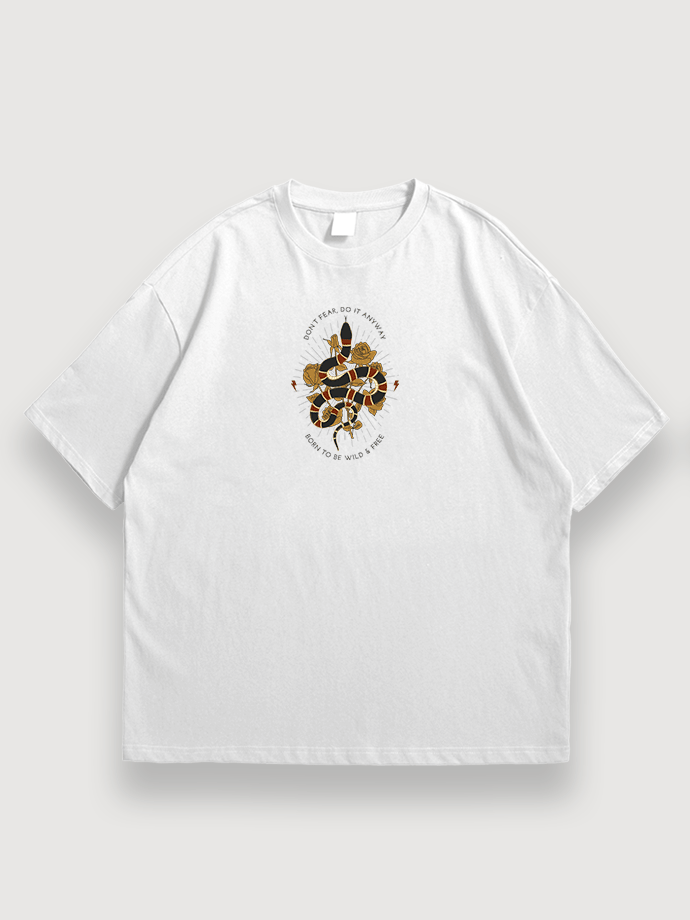 $55.00Embrace your wild side with the “Rebel’s Creed” tee. This design features a powerful, tattoo-inspired illustration of a serpent and roses, symbolizing the union of beauty and danger. Encircled by the mottos ‘Don’t Fear, Do It Anyway’ and ‘Born to Be Wild & Free,’ it’s a bold declaration of courage and untamed spirit. This isn’t just a design; it’s a philosophy. Wear your conviction.